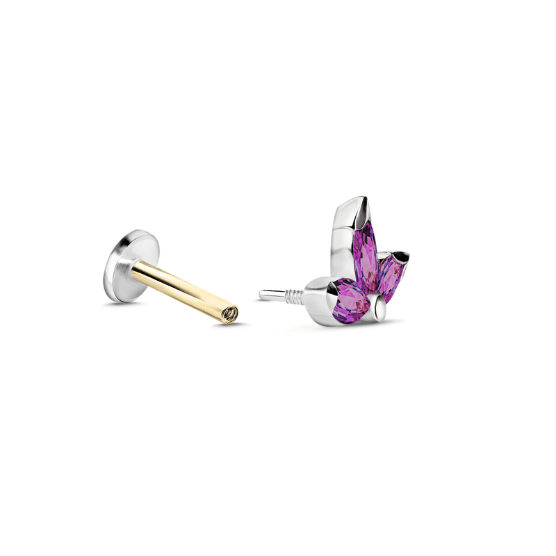 Jemný piercing do labretu zo 14-karátového bieleho zlata s vnútorným závitom, ktorý je ukončený tromi rodolitmi s celkovou hmotnosťou 0,112 ct. Je vhodný pre helix, tragus, lalok, konch a ploché typy piercingu. Šperk možno použiť na prvú aplikáciu piercingu.